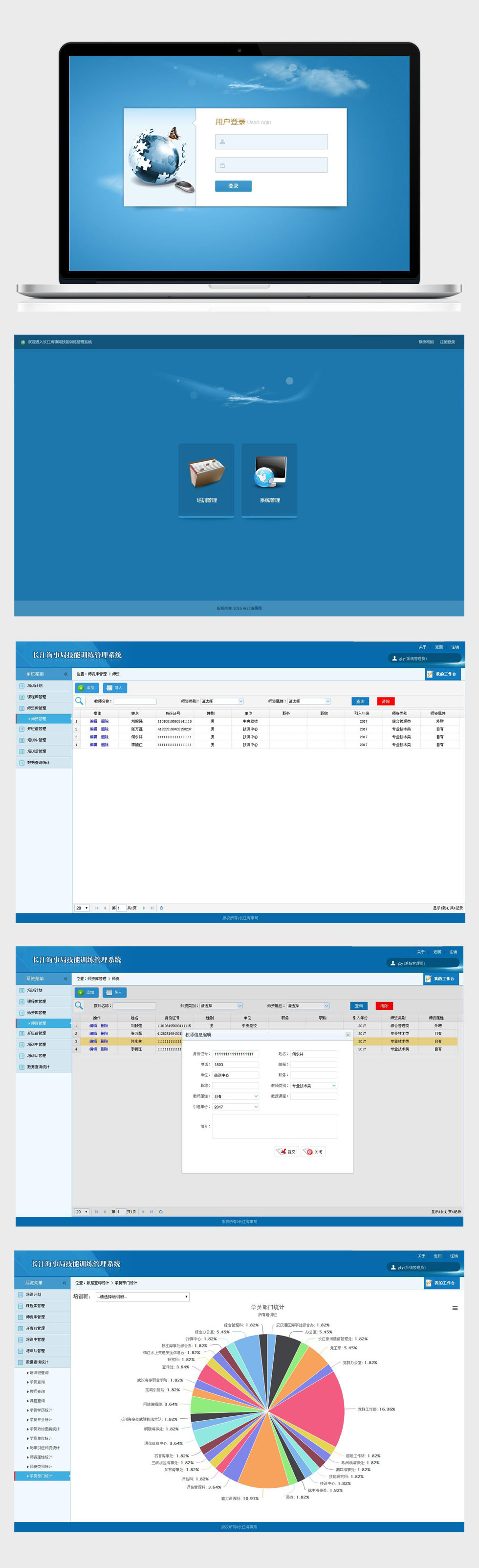 长江海事局技能训练管理系统,包含技能培训、课程管理、师资管理、学员管理、培训管理和数据统计等功能